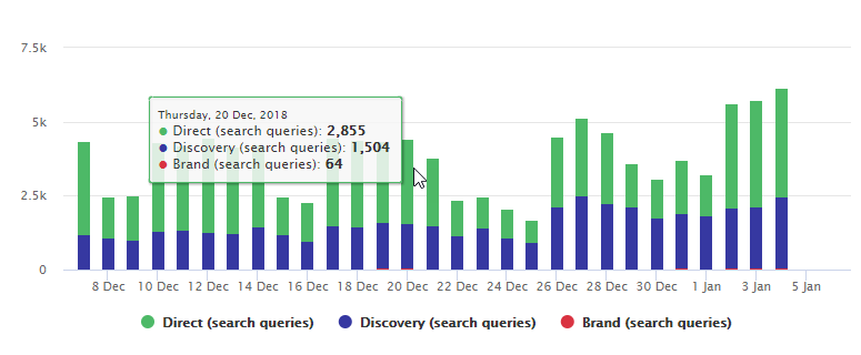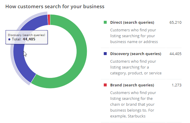 People who find a Google business listing by searching on the business name or address are considered to be Direct search queries, whereas people who find the business listing by searching for a category, product, or service are classified as Discovery search queries, and searches for a franchise or chain name are classified as Brand search queries.