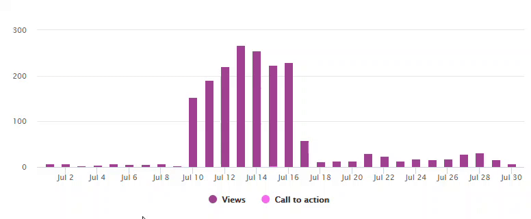 This graph provides a daily breakdown of post views and call-to-action clicks. For a custom view of one of the metrics, click the metric name of the other below the graph to hide its display.