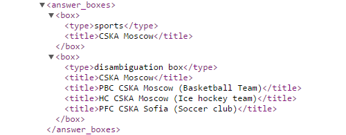 If a See Results About (aka disambiguation) box displays in the search results for your keyword, the API results will include a section labeled "box" and the titles of the items in that box.  In this example, the SERP also included a Sports answer box.