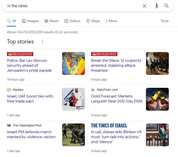 The above search results page also contains Site Links (a search result indicator found in Top 50 & Top 100 APIs in the Extra tag) and News (a search page indicator, refer to News result format further down this page).