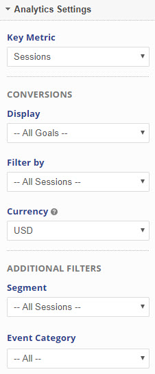 • Select a Key Metric filter: Sessions, Page Views, Bounce Rate, New Users, Pages per Session, Goal Completions, etc.