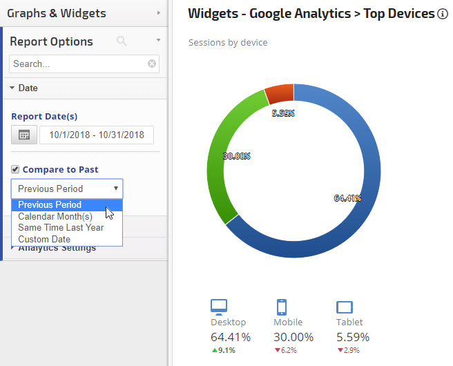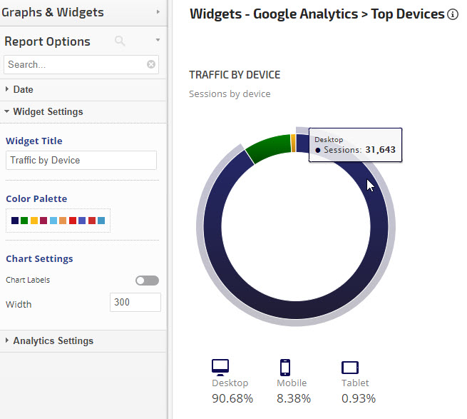 The Google Analytics Top Devices widget is a colorful graphic presentation a site's traffic from desktop, mobile and tablet based on key metrics from the website's Google Analytics account, including integration with AdWords campaigns. Data can be filtered by a variety of traffic metrics, dimensions, conversions, segments and events.