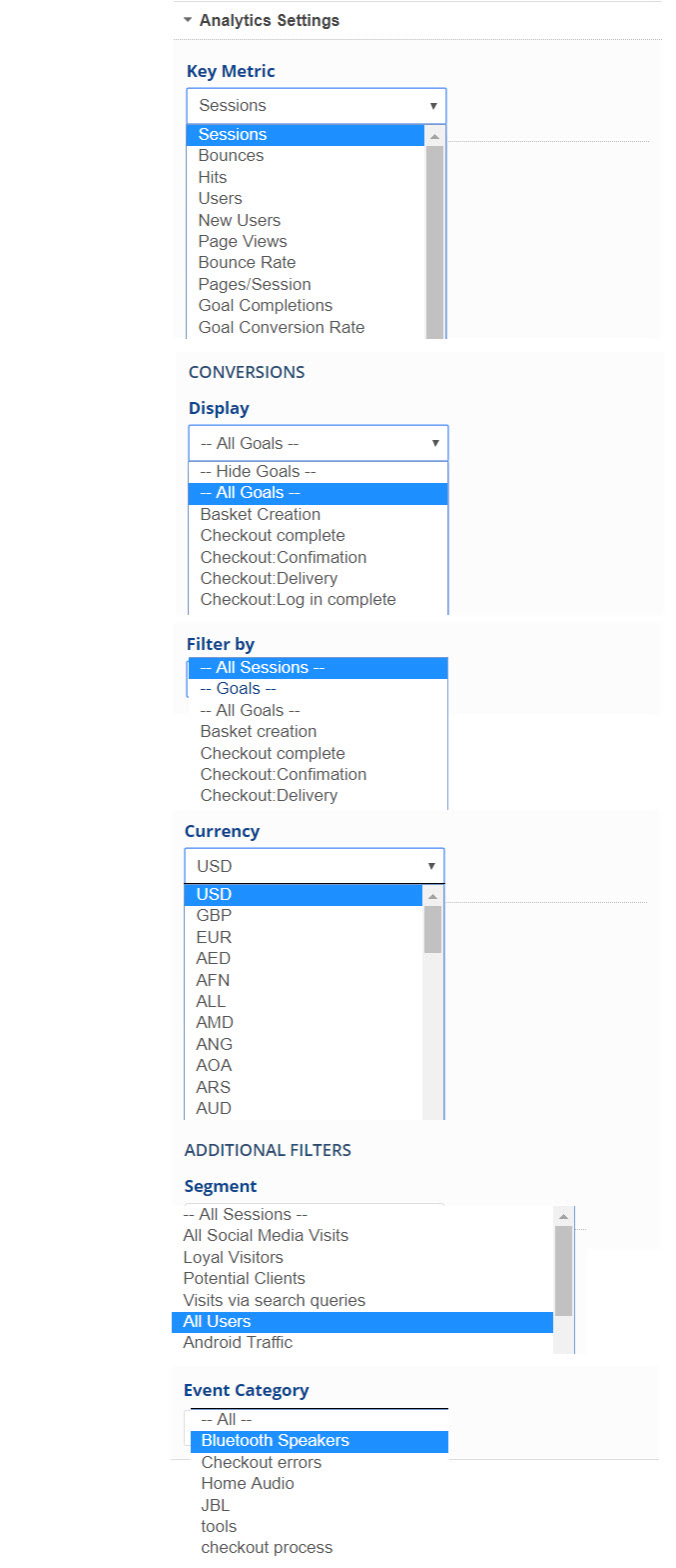 • Currency: If the currency you have set up in Google doesn't pass correctly through Google Analytics to your report, you can change the currency symbol with this setting.