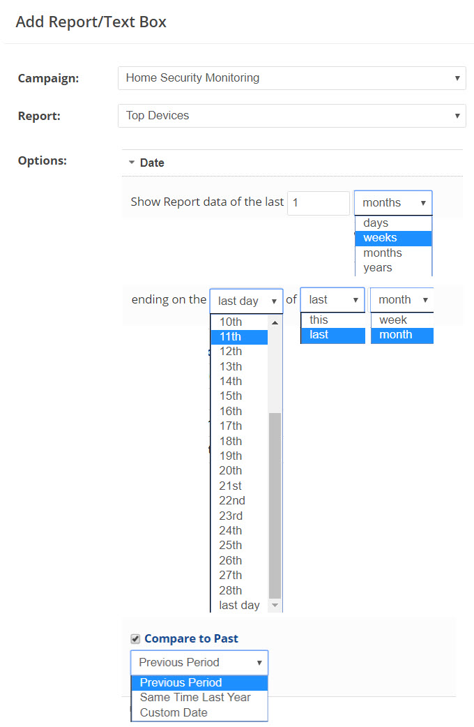 To change the number of weeks or months displayed in a specific report, click the gear icon for any marketing dashboard report element and expand the Date option section, enter the number and click the Save Button.