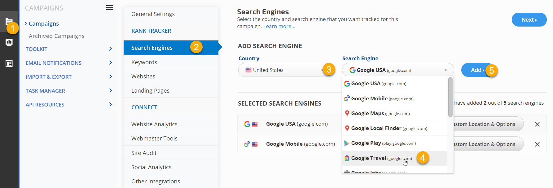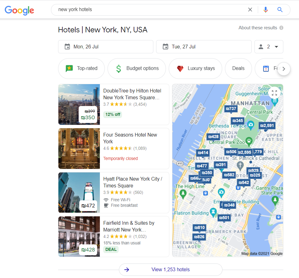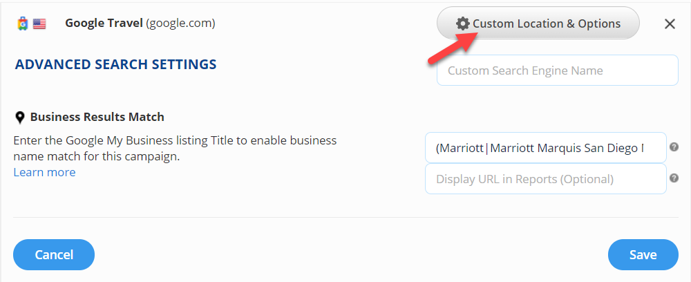 Previously we have been tracking Hotel Packs by setting up the Google Search Engine. Now, the Google Travel Search Engine can be tracked, which is a search engine option created for tracking the Google Travel Hotels Search site for the tracking keywords results with the matching Business Results specified in the settings of the Google Travel Search Engine under Campaigns > Search Engine. The available metrics in this search engine are business name, rank, rating, and price.