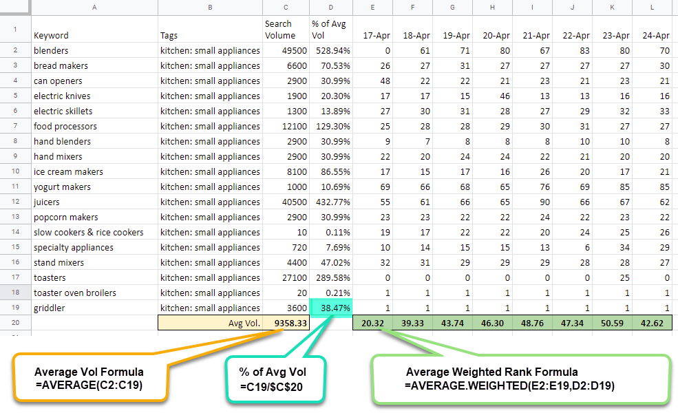 - Average Weighted Rank: utilizes the Average Weighted formula taking into account the rank for all keywords in the tag group and percentage of average volume.