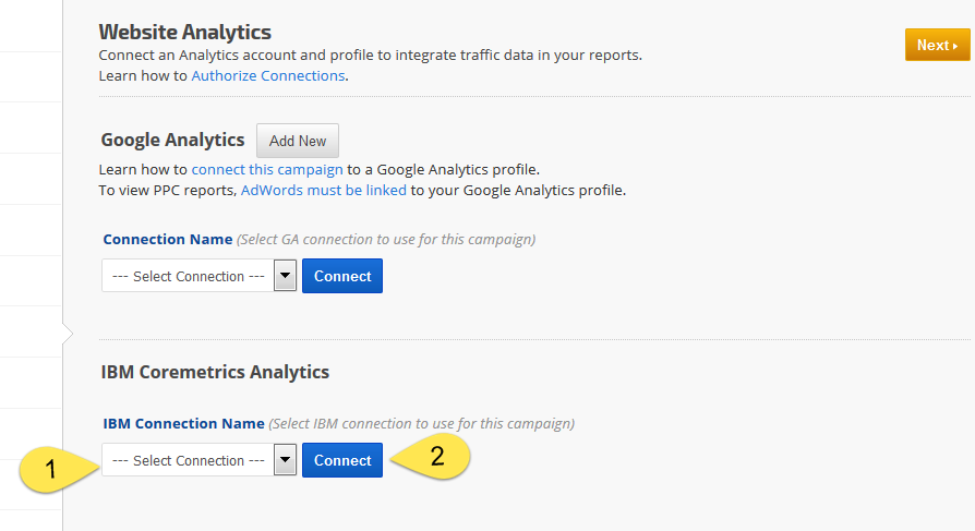 You can connect your campaign to your IBM Coremetrics Digital Analytics profile if you'd like to provide us with access to website analytics data for integration into your reports.