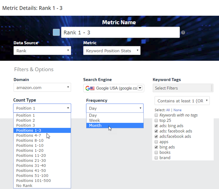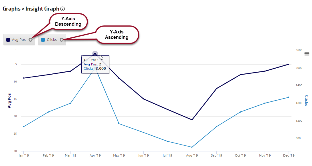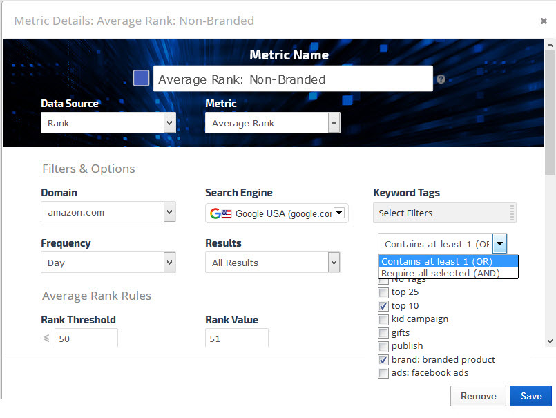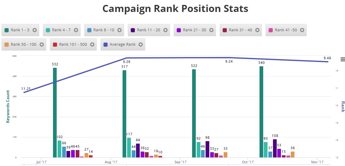 Average Rank is the average rank of all campaign keywords combined for the selected time period. When you select the Average Rank Metric Type, you have a variety of options and filters to utilize for customizing your Insight Graph.