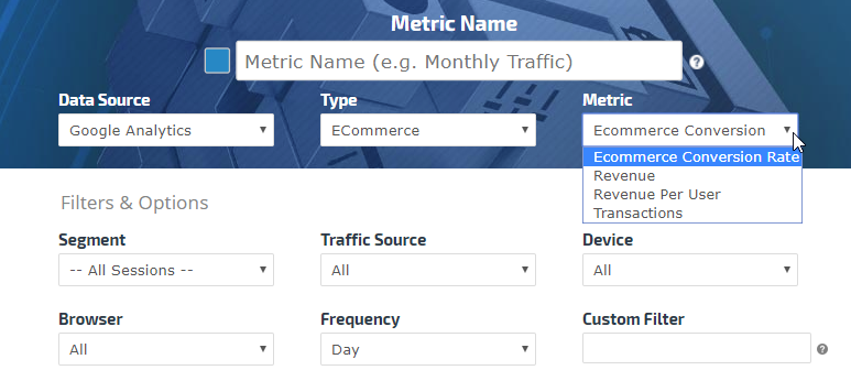 • ECommerce: Ecommerce Conversion Rate, Revenue, Revenue per User, Transactions, Avg, Order Value, Unique Purchases