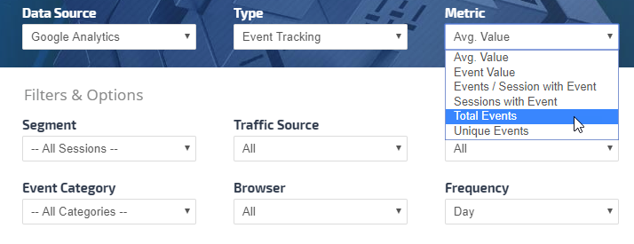 • Event Tracking: Average Value, Events per Session with Event, Event Value, Sessions with an Event, Total Events, Unique Events
