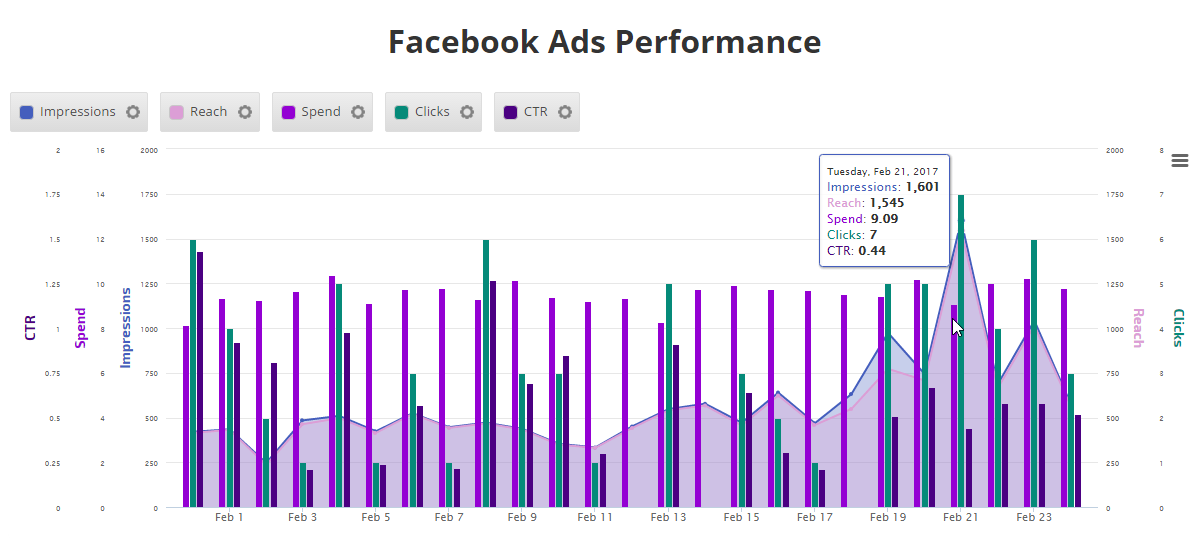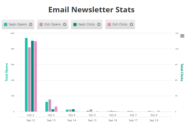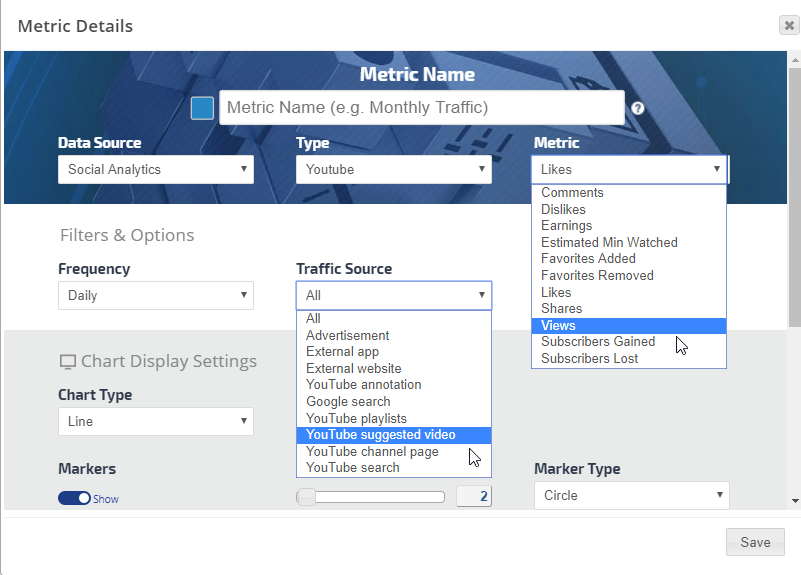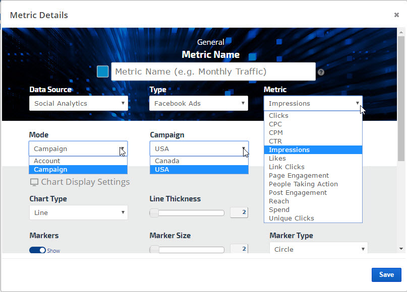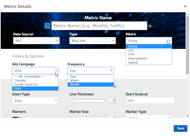 When you're finished creating a graph, save a personalized version and then create additional versions using different metrics, variables, and styles of that graph for the same campaign using our Preset feature.   Export your creation to a variety of image types or PDF, or add it directly to an existing Marketing Dashboard or scheduled White Label PDF Report.