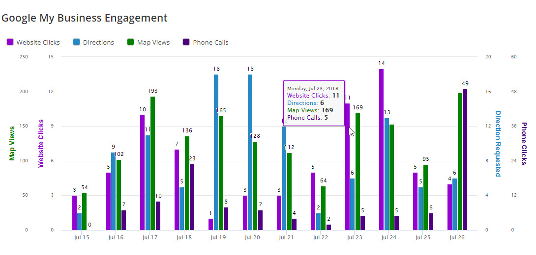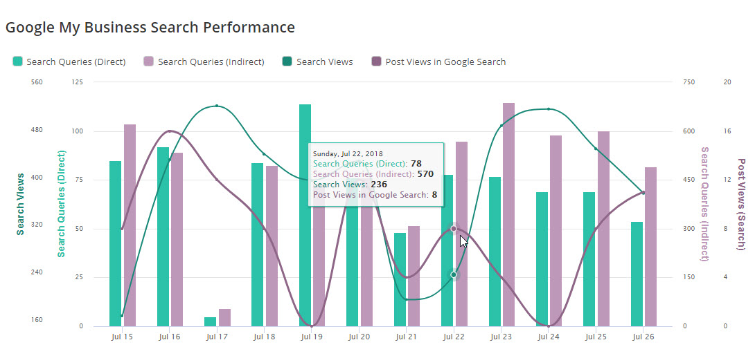 Google My Business: Directions, Map Views, Phone Calls, Photo Count (Business), Photo Count (Customers), Photo Views (Business), Photo Views (Customers), Post Call to Action (Search), Post Views (Search), Search Views, Search Queries (All), Search Queries (Brand), Search Queries (Direct), Search Queries (Indirect), and Website Clicks