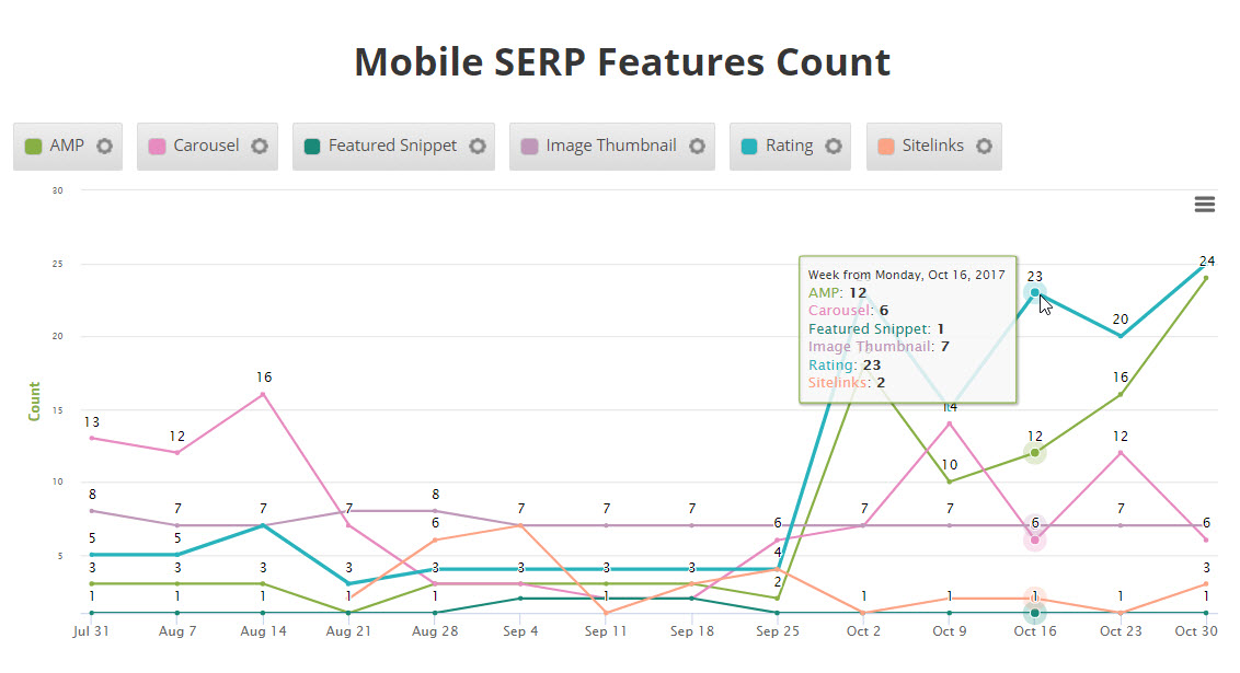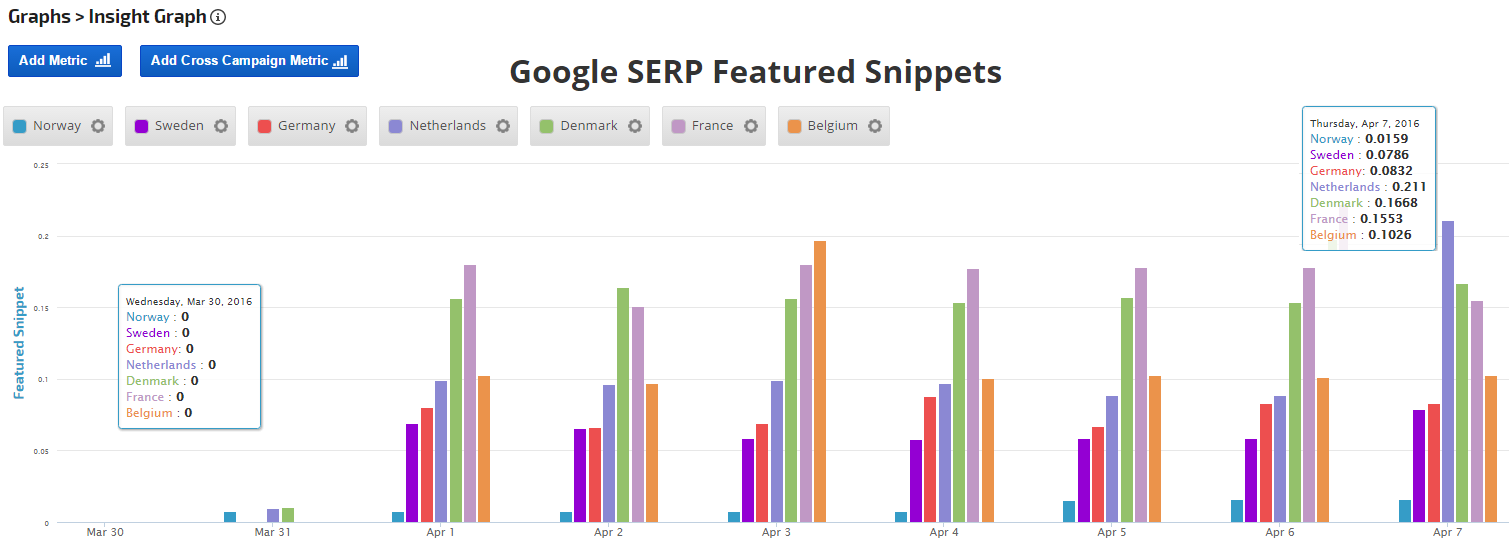 Certain SERP metrics also have options to display data either by the average number of occurrences per page or as a percentage.