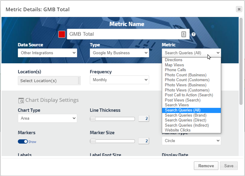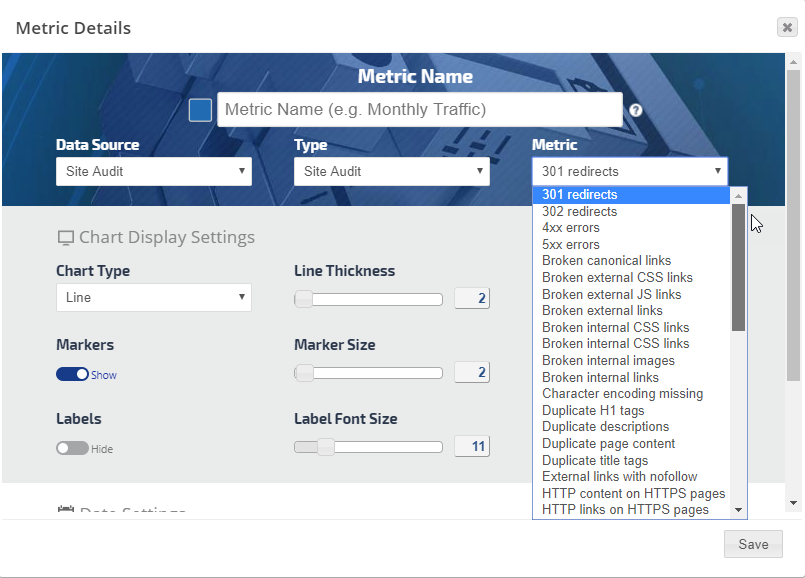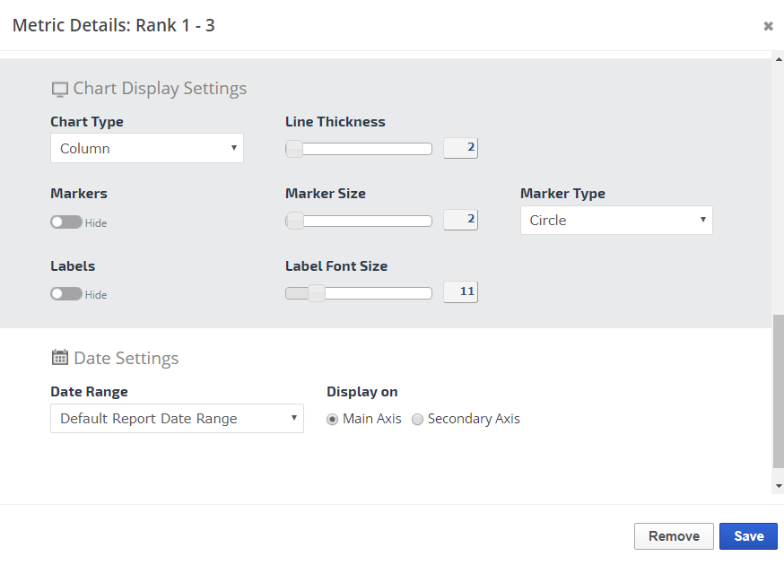 • Click the Add Metric button to create a new metric. Refer to Add Metric, Metric Settings, Display Settings, and Date Settings sections below for a description of the many available options.