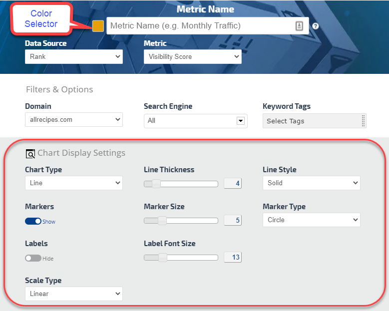 Select color, chart type, line thickness, Show or Hide markers and labels and customize type and size.