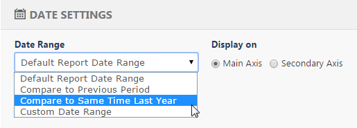 Compare results to the previous period, same time last year or select your own custom date range, and view with your choice of Main or Secondary Axis options.