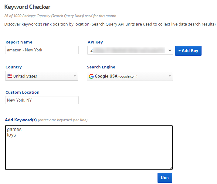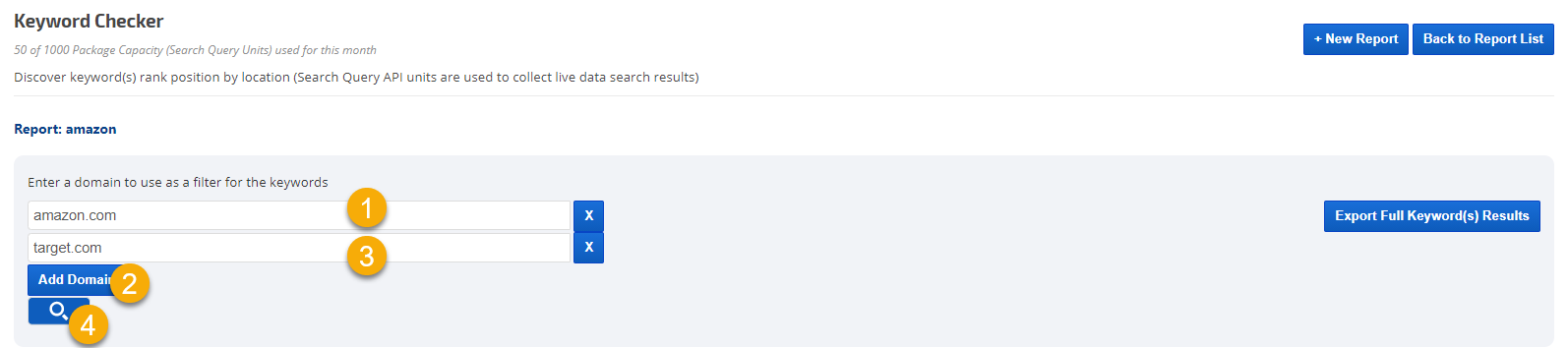 - Click on the +New Report button in the Keyword Checker Tool and