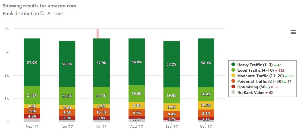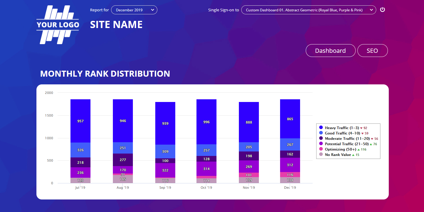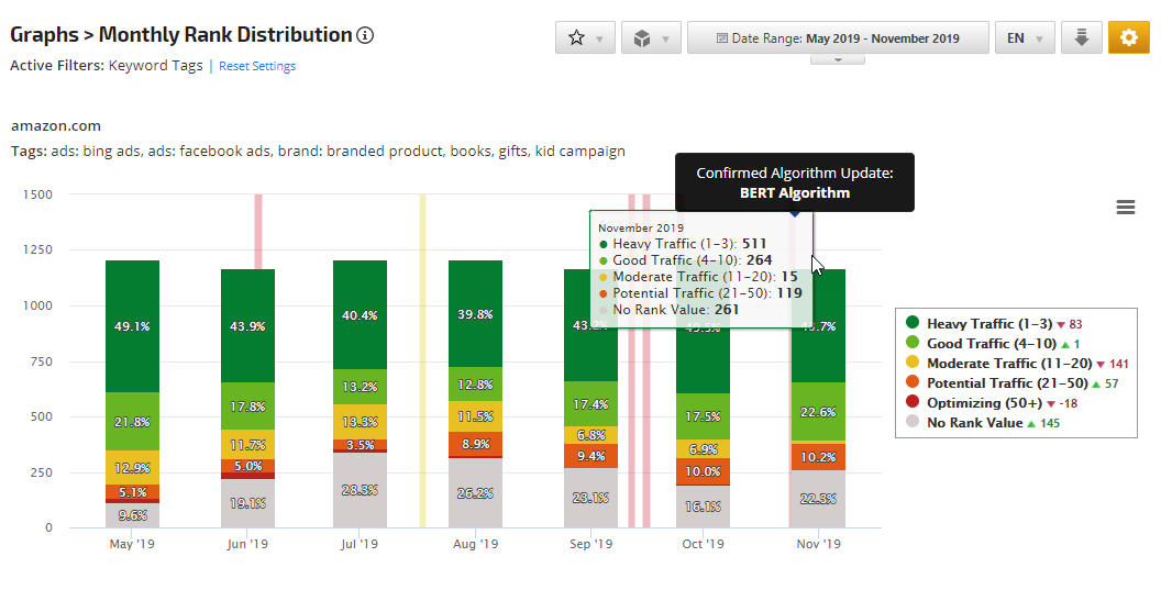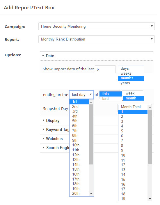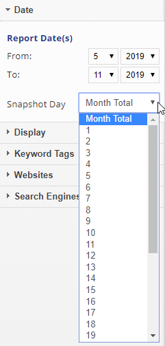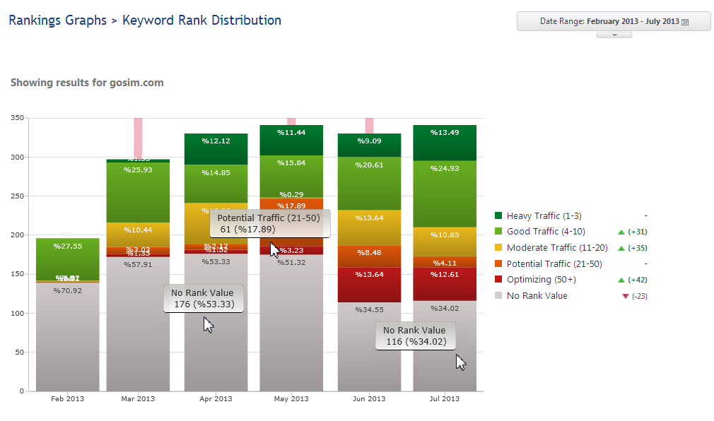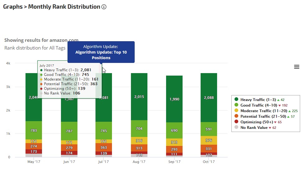 The Monthly Keyword Rank Distribution graph provides an analysis that visually demonstrates results of strong SEO efforts and/or lack thereof. You can run it for full month total rank data or select a specific snapshot day. Additional filters allow you to show or hide any of the keyword rank position options.