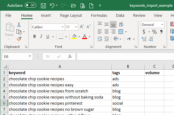 - Optional: add column titles "tags" and/or "volume" (for local search volume if you have it recorded) and enter the corresponding data
