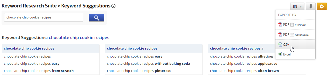 If you'd like to work with the keyword results, you can export them in PDF, CSV or Excel format.