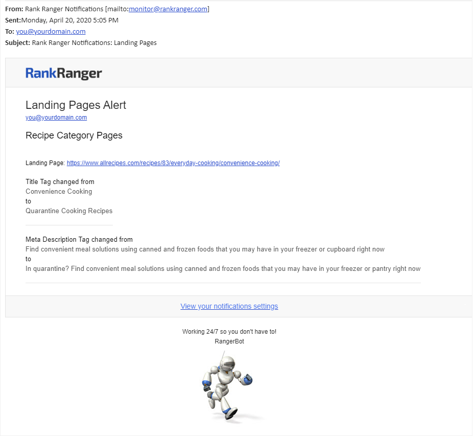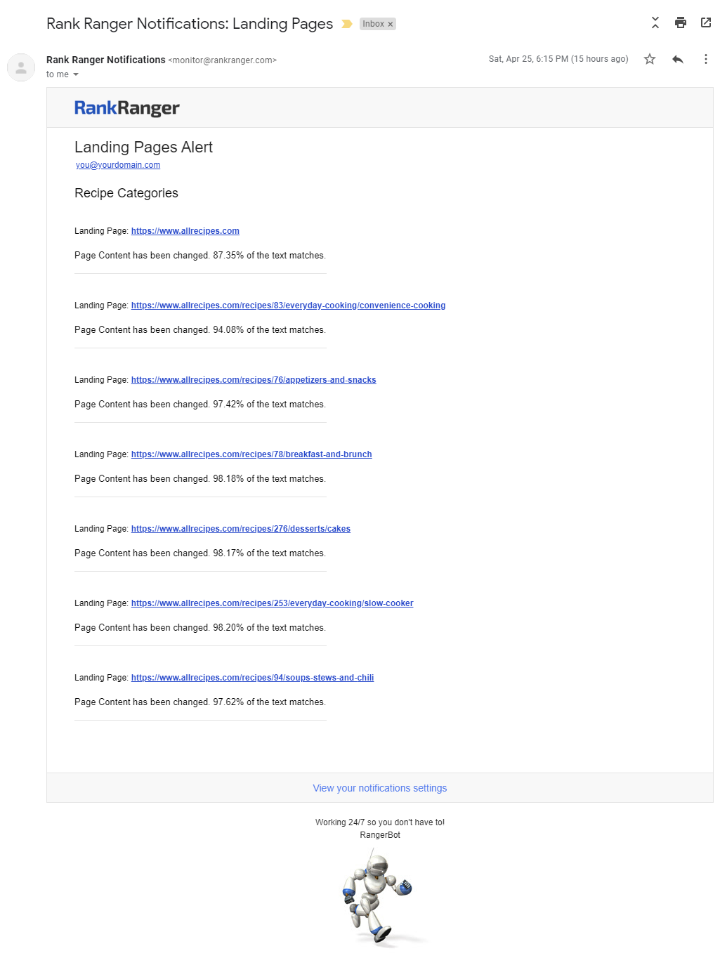 Landing Page Email Notifications can help you reduce, or explain, unexpected rank changes that can occur when someone modifies website content or redirects pages without considering the effects those changes can have on SEO. How? By notifying you when changes are detected, thus providing you with the information needed to determine if adjustments may be required to the rank tracking campaign or website.