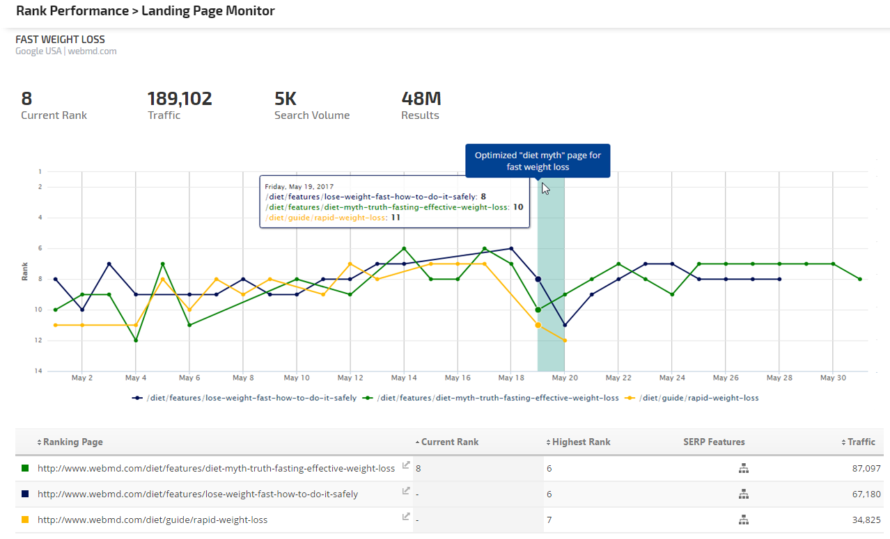 Rank Tracker Dashboard displaying 100+ as the rank result for several keywords. Options exist in the Account Settings > Theme & Localization screen to set no rank within tracked results as "100+", "N/A", "NR", or "-"