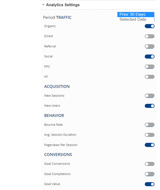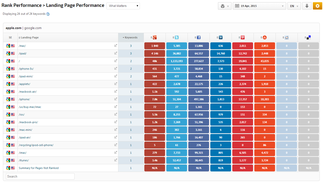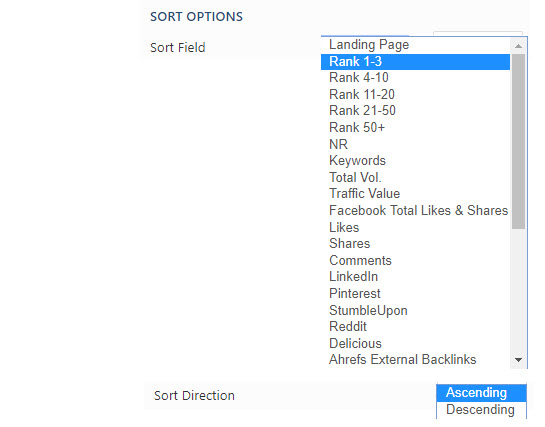 Keyword rank distribution, social signals, organic traffic and all traffic for specific landing pages are some of the options in our Landing Page Performance report. Filter and Sort selecting from a variety of parameters.