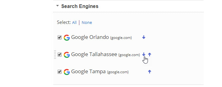 If multiple Search Engines are selected, you have the option to change the display order by clicking the arrow next to the Search Engine and dragging it into the desired order.