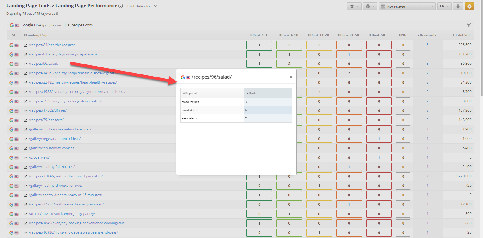 Click the Landing Page link or number in the Keywords column to view the Keywords that ranked for a specific page.