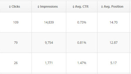 keyword that led users to click through to the site, along with the number of impressions, clicks, CTR, and rank position of each