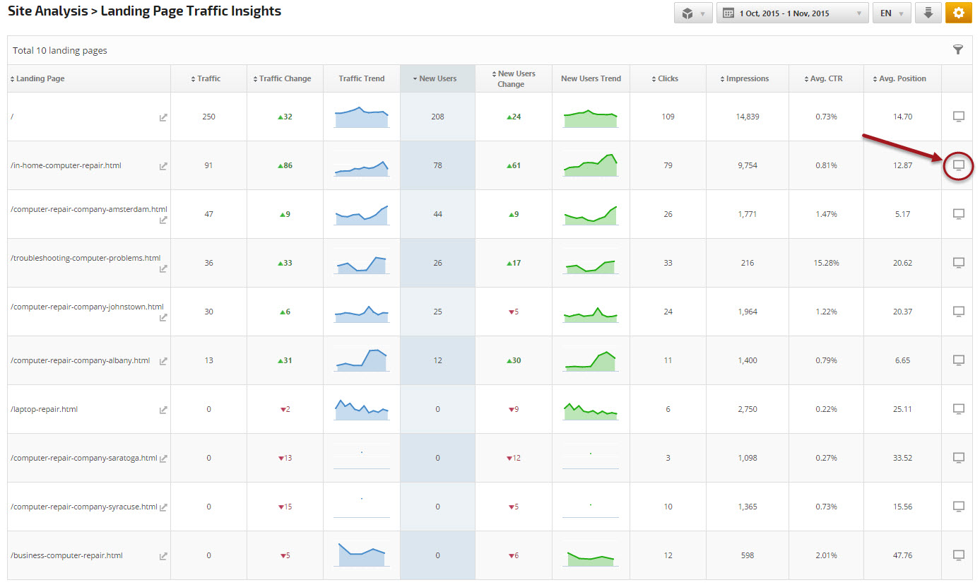 keywords that ranked for the landing page by clicking the screen icon at the end of any row.