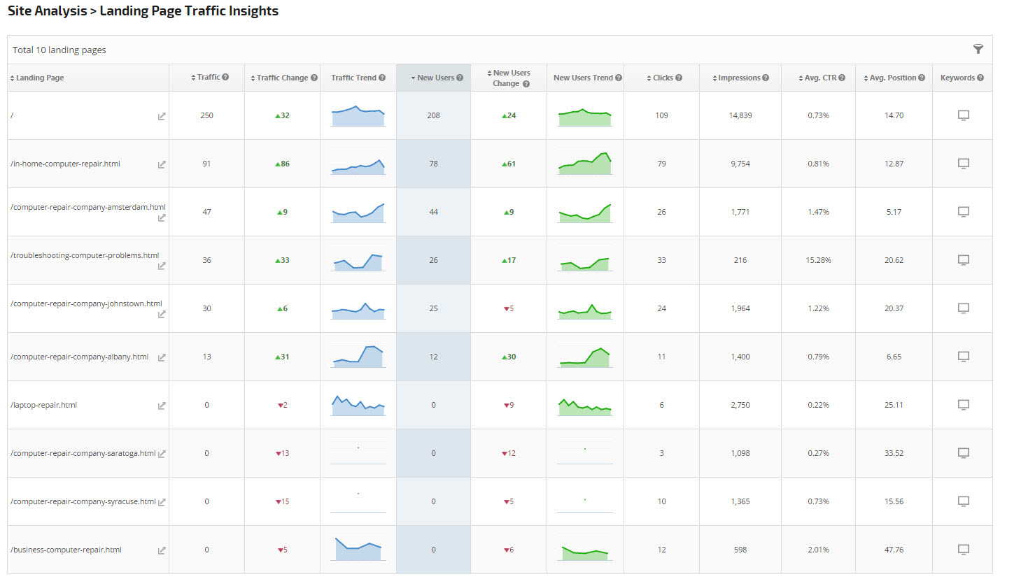 Google Analytics organic traffic, traffic change and a traffic trend graph provide insights into how specific landing pages are performing.