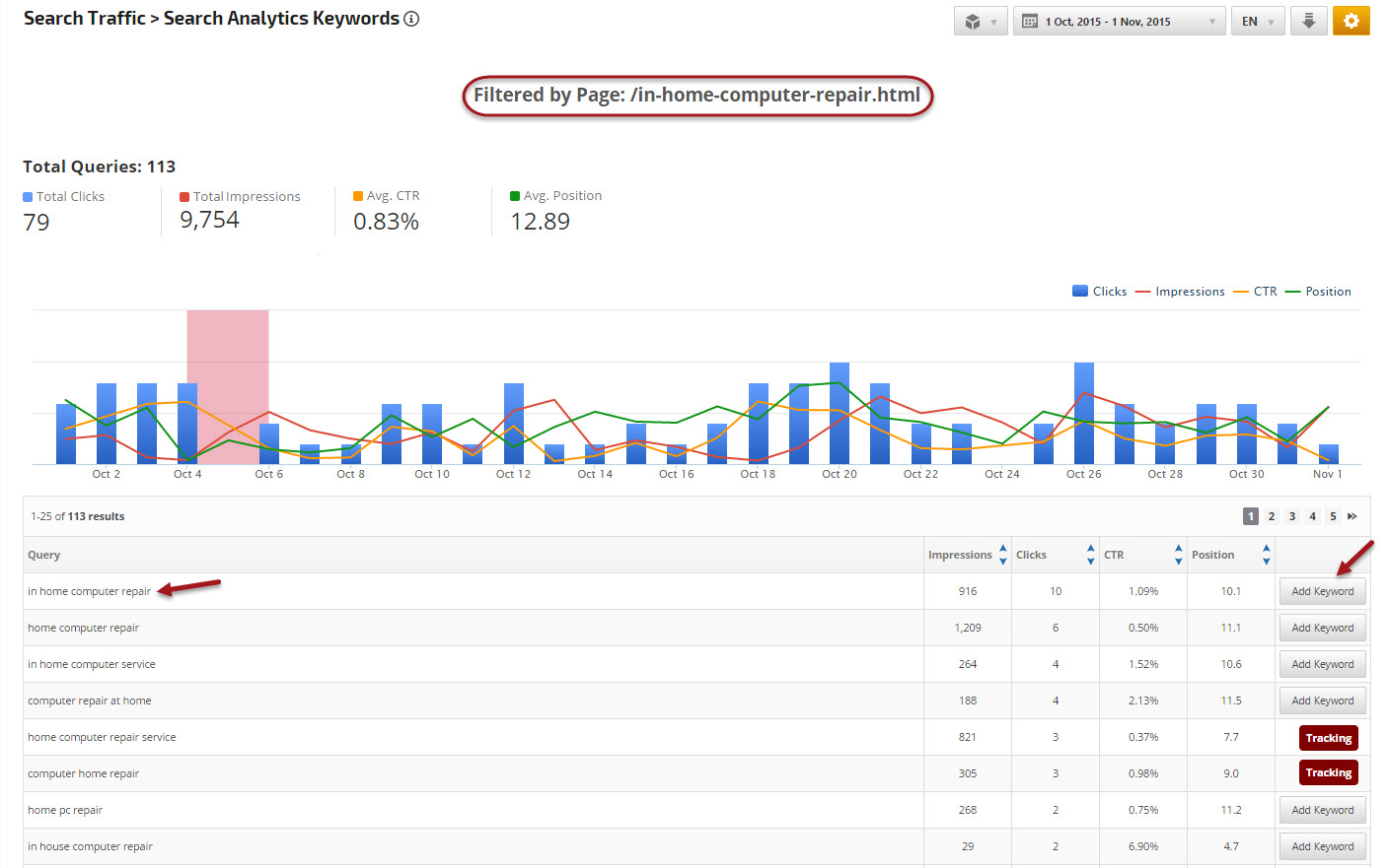 Search Analytics Keywords report launches filtered by the landing page you selected in the Landing Page Traffic Insights report and reveals