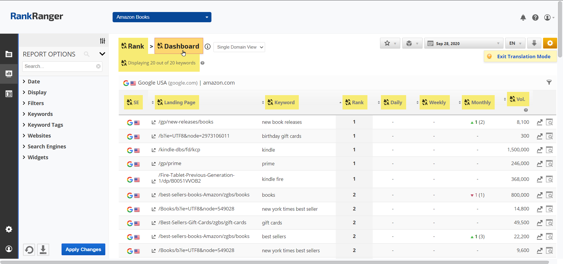 We will send you an email when your suggestions have been approved and added to Rank Ranger, however, if you're curious about your translations as well as those submitted by others, you can access the tool by hovering over the language selector in any of the reports and clicking