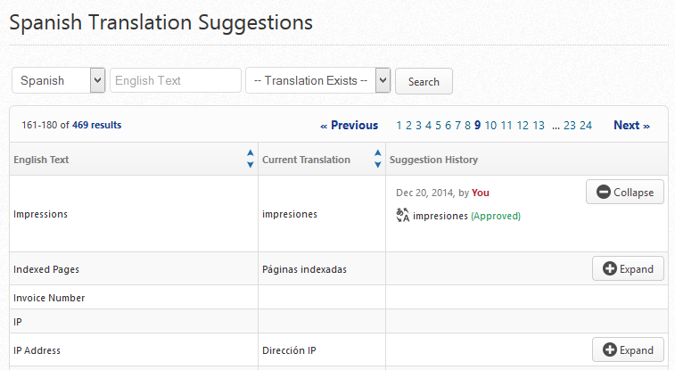 A table displays the English Text, Current Translation, and Suggestion History. Words that translations have been submitted for display an Expand/Collapse button. Click the