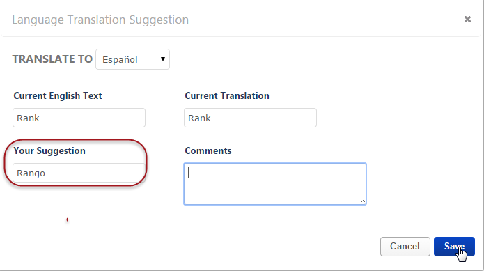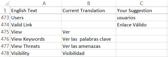Suggestions can be made on-screen or by downloading and completing the translation spreadsheet for the desired language.