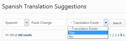 You can search the status of a specific word or an entire language by selecting the language, entering the word, and selecting Yes or No in the Translation Exists field, then click the Search button.