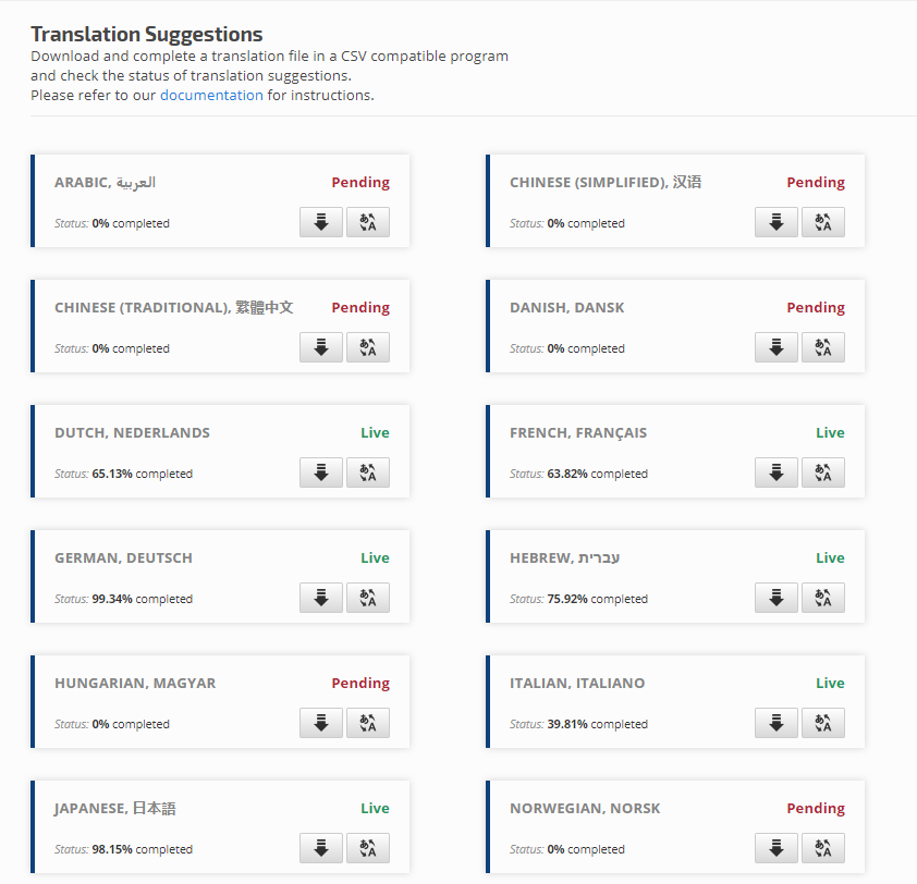 Locate the language you want to translate and click the down arrow to download the CSV file.