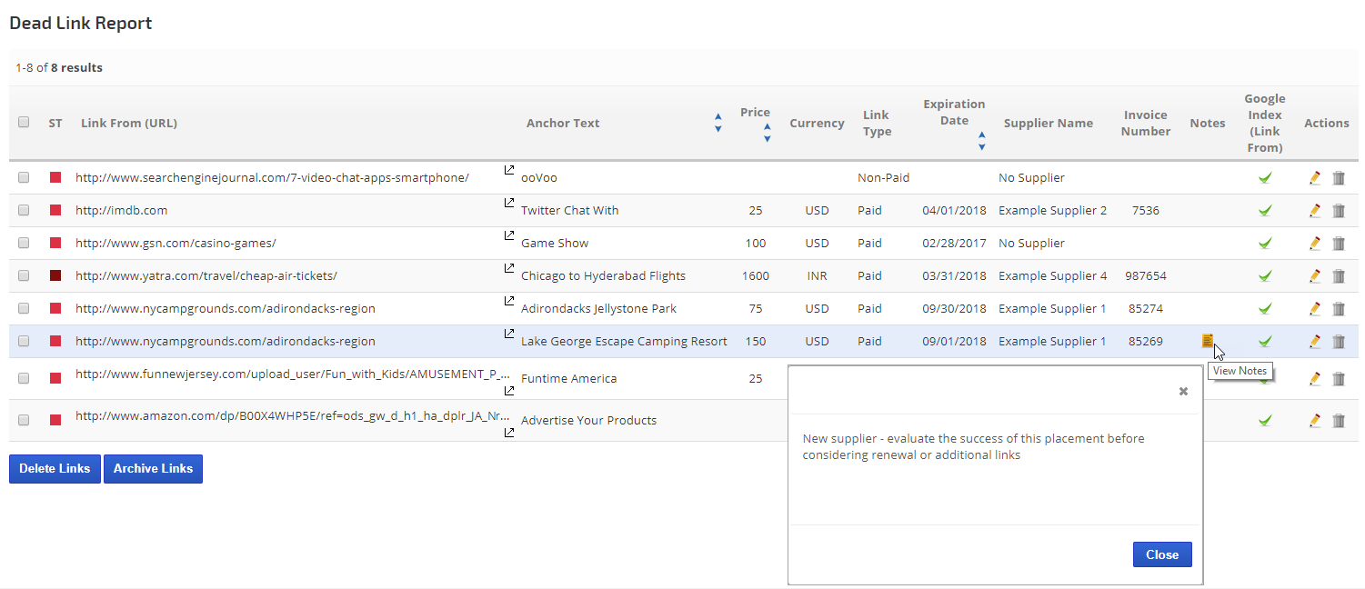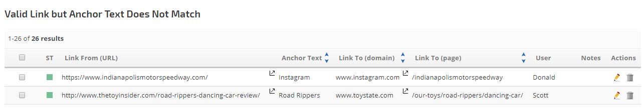 In this quick view we've displayed the Status, Link From URL, Anchor Text, Link To domain and landing page.