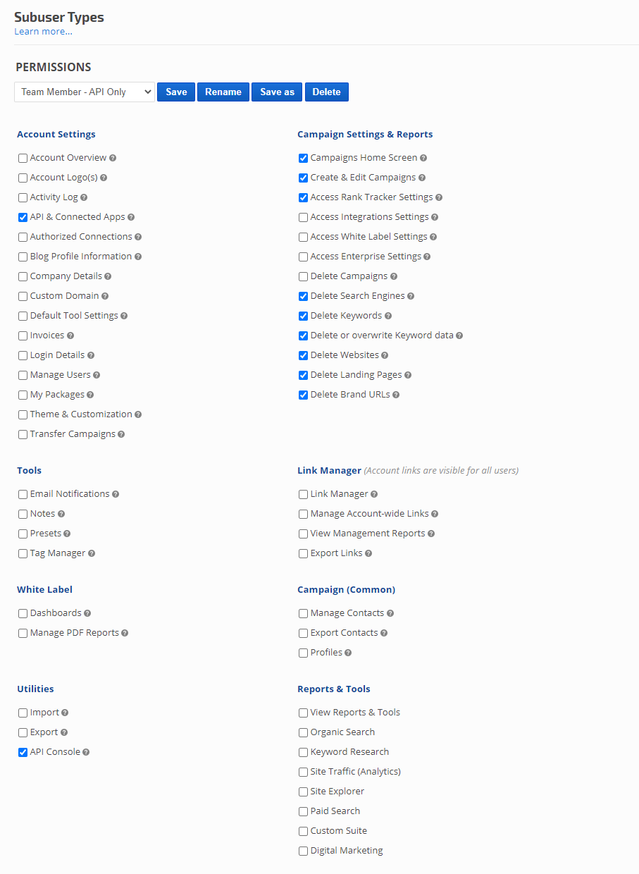 Grant access and permissions to multiple account users (e.g., co-workers, employees, and contractors) for a variety of functions in your Rank Ranger account including managing rank tracking campaigns, links, dashboards, white-label PDF reports, profiles, and more. The number of users allowed per account is dependent upon the package you subscribe to, if you need to add more users, please contact customer service.