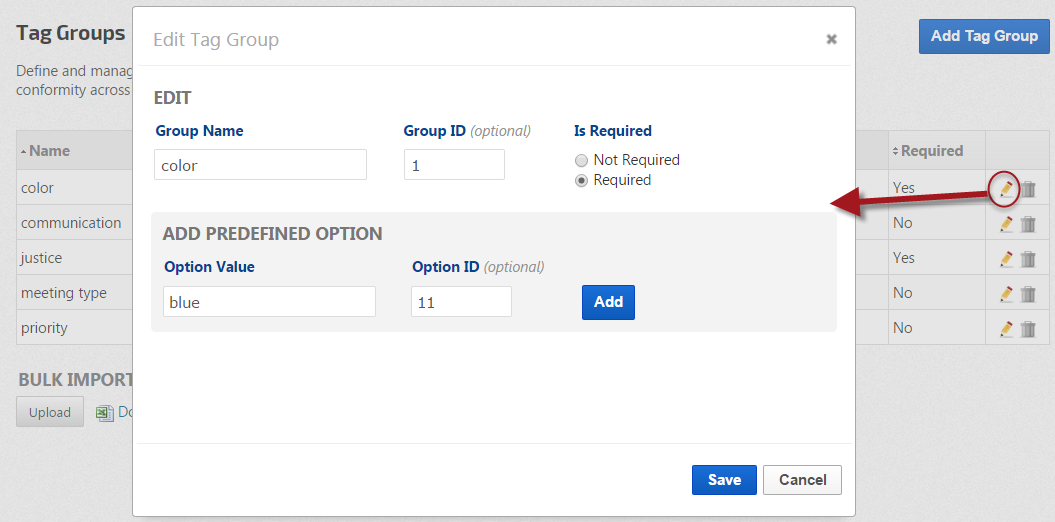 - Click the edit (pencil) icon corresponding to the Tag Group you want to add options to.