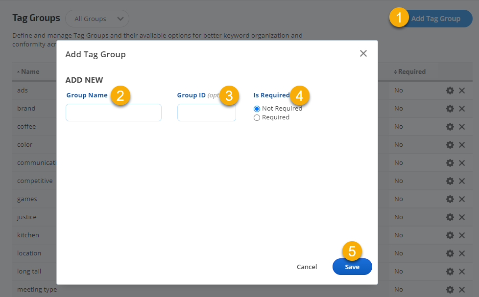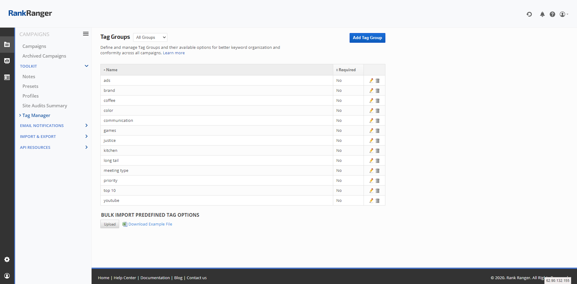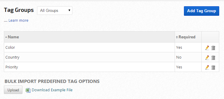 For each tag group, you can create a list of tag options that users can choose from when assigning tags to keywords. There are several options for adding predefined tag options to a Tag Group: individual, multiple keywords/same tag or via bulk import.