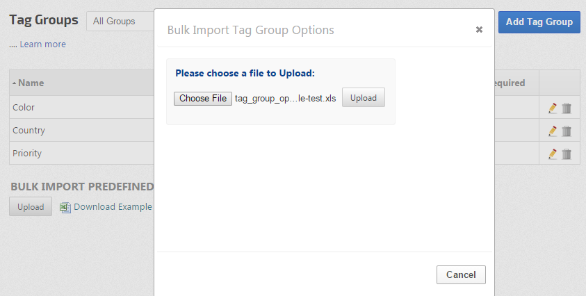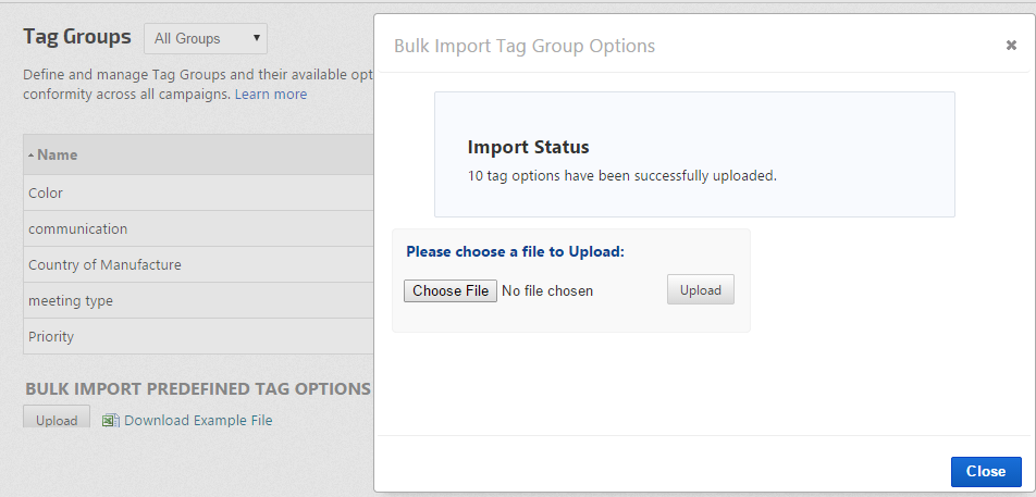 - Return to the Tag Manager screen and click the Upload button that is beside the Download Example File link.