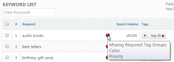 Campaign Settings > Keywords screen users will see a red warning icon indicating that a "Missing Required Tag Group: Group Name" needs to be added to the keyword.