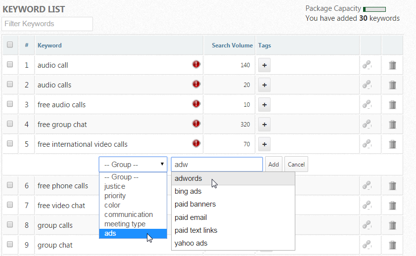 There are 2 options for adding tags to keywords: individually or via bulk import.