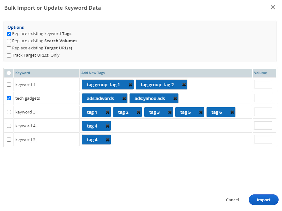 - Review the keyword and tag data: check the boxes of the keywords & tags you want to import