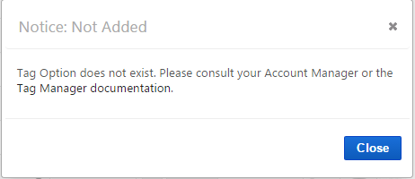 If you attempt to add a Tag Option that does not exist in the selected Tag Group, an error message displays indicating that you need to consult with the Account Manager. If you are the Account Manager or have user permissions to manage tags, then you should open Tag Manager and confirm the Tag Options for the selected group.