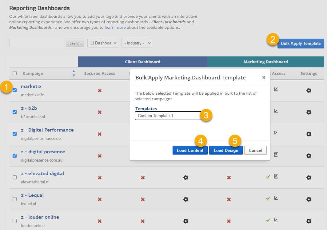 In the White Label menu click on Dashboards to access a list of all Marketing Dashboards of campaigns in the account