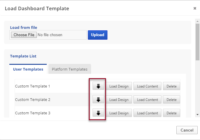 When you have uploaded or created and saved dashboard templates, then you may choose to load the design and/or report content in any campaign by clicking the corresponding button.