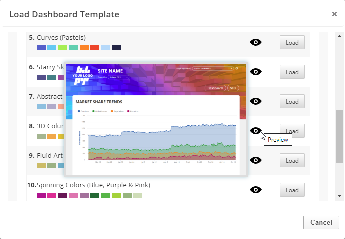 There are a variety of report templates available in the Dashboard Template Library where you can test live previews and download the one you want, and upload into your account.